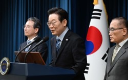 이재명 대통령이 14일 서울 용산 대통령실 청사에서 한·미 팩트시트 타결 결과를 발표한 후 환하게 웃고 있다. 대통령실사진기자단 검찰의 대장동 민간업자 사건 1심 재판 ‘항소 포기’ 사태가 정치권의 최대 쟁점으로 떠오른 가운데, 이재명 대통령의 지지율이 조사 업체…