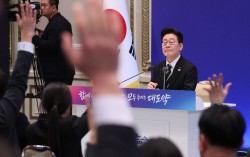 이재명 대통령이 21일 오전 청와대 영빈관에서 2026 신년 기자회견 '함께 이루는 대전환, 모두 누리는 대도약'에서 취재진 질문에 답하고 있다. 청와대사진기자단 이재명 대통령이 21일 더불어민주당 원내지도부를 향해 “민생 현안, 각종 개혁 과제를 처리하는 데에 …