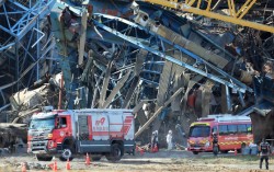 울산화력발전소 보일러 타워 붕괴 사고 엿새째인 11일 오후 발전소 보일러타워 4호기 6호기가 발파 해체한 후 중앙사고수습본부(중수본) 관계자들이 실종자 수색 재개를 위해 현장을 살피고 있다. 연합뉴스 한국동서발전 울산화력발전소 붕괴 사고 매몰자 수색·구조…