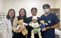 이대목동병원, 이대서울병원 의료진이 헌신적인 노력으로 하마터면 사망할 뻔한 산모와 아이를 살렸다. 조유경 이대서울병원 장기이식코디네이터, 산모 신씨와 남편·아기, 홍근 이대서울병원 장기이식센터장(왼쪽부터). 이화의료원 제공 산모와 태아가 수차례 생명에 위…