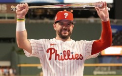 내셔널리그의 승리를 이끈 카일 슈와버가 MLB 올스타전 MVP에게 주어지는 크리스털 배트를 들어보이고 있다. AP=연합뉴스 올 시즌 메이저리그(MLB) 올스타전이 역대 최초로 스윙 오프 타이브레이커(홈런 더비, 이하 스윙 오프…