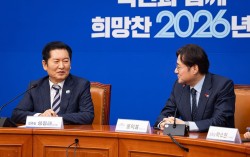 이재명 대통령이 21일 청와대 영빈관에서 열린 신년기자회견에서 발언하고 있다. 연합뉴스 이재명 대통령은 21일 '사랑하는 강훈식 비서실장을 지방선거 출마를 위해 떠나보낼 수 있느냐'는 질문에 "저는 제 아내를 사랑한다"고 웃으며 답했다. 자리에 함께 있던…