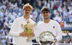 카를로스 알카라스(오른쪽)를 꺾은 얀니크 신네르(왼쪽)가 우승 트로피를 들고 있다. [EPA=연합뉴스] “페더러-나달을 이을 새 라이벌이 탄생했다.” 영국 데일리 메일은 14일(한국시간) 얀니크 신네르(24·세계 1위·이탈리아)가 시즌 세 번째 메이저 테…