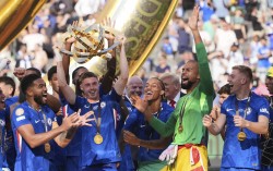 첼시의 콜 파머가 FIFA 클럽월드컵 우승 트로피를 들어 올릴 때까지, 도널드 트럼프(뒤) 미국 대통령은 시상대를 떠나지 않고 정중앙에 계속 서 있었다. 눈치 없는 행동에 첼시 선수들은 당황했지만 그대로 우승 세리머니를 이어갔다. [AP=연합뉴스] 첼시(…
