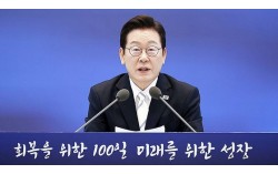이재명 대통령이 취임 100일째가 되는 11일 오전 서울 청와대 영빈관에서 ‘회복을 위한 100일, 미래를 위한 성장' 기자회견을 하고 있다. 대통령실사진기자단 이재명 대통령이 취임 100일 일성으로 "모든 국민을 아우르고 섬기는 '모두의 대통령'이 되겠다는 약…