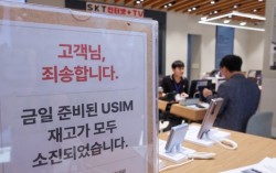 가입자 유심(USIM) 정보를 탈취당한 SK텔레콤이 유심 무료교체 서비스를 시작한 지난달 28일 서울 시내 한 SKT 매장에 유심 재고 소진 안내문구가 적혀있다. 연합뉴스 과학기술정보통신부가 1일 SK텔레콤에 대해 유심(USIM) 물량 공급이 안정화 될 때까지 이…