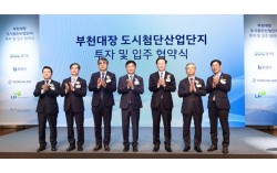 대한항공과 부천시가 30일 부천아트센터에서 '도심항공교통(UAM) 및 항공안전 연구개발 단지' 협약식을 맺었다. 오른쪽부터 이한준 한국토지주택공사 사장, 우기홍 대한항공 부회장, 조용익 부천시장, 손임성 경기도 도시주택실장, 원명희 부천도시공사 사장. 연합뉴스 …
