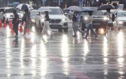 서울 지역에 호우주의보가 발령된 13일 서울 종로구 광화문네거리에서 우산을 쓴 시민들이 출근길 발걸음을 재촉하고 있다. 뉴스1 서울·인천·경기 등 3개 시도에 호우특보가 발효되자 행정안전부는 13일 오전 11시부로 중앙재난안전대책본부(중대본) 1단계를 가동했다. …