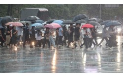 서울 지역에 호우주의보가 발령된 13일 서울 종로구 광화문네거리에서 우산을 쓴 시민들이 출근길 발걸음을 재촉하고 있다. 뉴스1 13일 인천 옹진군 덕적도에 1시간 동안 150㎜에 달하는 호우가 쏟아졌다. 기상청 자동기상관측장비(AWS) 관측기록을 보면, 옹진…