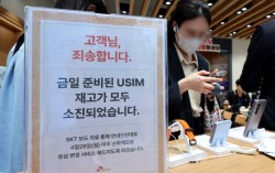 가입자 유심(USIM) 정보를 탈취당한 SK텔레콤이 유심 무료교체 서비스를 시작한 28일 서울 시내 한 SKT 매장에 유심 재고 소진 안내문구가 적혀있다. 연합뉴스 SK텔레콤 해킹 사태로 인한 유심(USIM) 교체 대상자가 2500만명에 달함에 따라 수천t의 온실…
