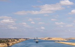 지난 5일(현지시간) 홍해 수에즈운하를 통과하는 미 해군 이지스 구축함 USS 베인브리지. 이란은 25일 홍해까지 봉쇄하겠다고 위협했다. 홍해 바브엘만데브해협은 전 세계 해상 원유 교역량의 약 12%를 차지한다. [AFP=연합뉴스] 미국과 이스라엘이 인공…