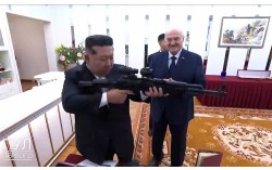 26일(현지시간) 김정은 북한 국무위원장이 평양에서 알렉산드르 루카셴코 벨라루스 대통령이 선물한 돌격소총을 들어보고 있다. AFP=연합뉴스 김정은 북한 국무위원장은 26일(현지시간) 알렉산드르 루카셴코 벨라루스 대통령이 선물한 VSK 돌격 소총을 들어 보이며 미소…