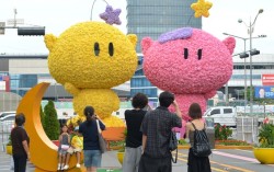 대전 0시 축제가 중앙로 일원에서 열리는 가운데 11일 관광객들이 꿈돌이와 꿈순이 조형물을 감상하고 있다.