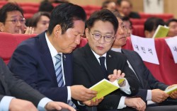 김남준 전 청와대 대변인이 지난달 2일 인천 계양구 경인교육대학교에서 열린 '쉬운 정치, 김남준' 북콘서트에서 정청래 더불어민주당 대표와 자신의 저서 『쉬운 정치』를 보며 대화하고 있다. 연합뉴스 6·3 지방선거 대진표가 속속 확정되면서 함께 치러지는 국회의원 재…