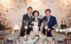구자관 삼구아앤씨 책임대표사원(맨 오른쪽)과 올해 회갑을 맞은 김춘자씨(가운데)가 22일 서울 강남구의 한 레스토랑에서 생일 케이크를 커팅하고 있다. 이 회사는 올해부터 회갑을 맞이한 직원을 위해 '찾아가는 회갑연' 행사를 개최한다. 사진 삼구아이앤씨 국내 1위…