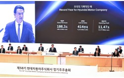 26일 현대자동차 양재동 본사사옥에서 진행된 제58기 정기주주총회에서 호세 무뇨스 대표이사·사장이 인사말을 하고 있다. [사진 현대차] “드디어 여기에서 보네요. 아틀라스, 보고싶었습니다.” 26일 서울 서초구 양재동 현대자동차 본사. 제58기 현대…