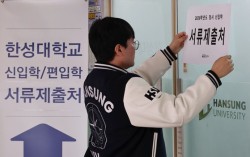 2026학년도 대입 정시모집 원서 접수가 시작된 29일 서울 성북구 한성대에서 입학관리팀 관계자가 서류제출 안내문을 붙이고 있다. 연합뉴스 2026학년도 대입 정시 모집에서 서울대의 경쟁률이 전년보다 소폭 하락한 것으로 나타났다. 입시업계에서는 역대급 ‘…