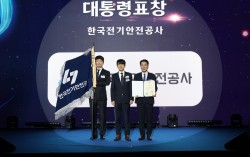 17일 한국에너지대상에서 기후에너지환경부 안세창(가운데) 기후에너지정책실장과 전기안전공사 김성주(오른쪽) 기술이사 등이 대통령표창을 받고 기념촬영을 하고 있다. 한국전기안전공사 제공 한국전기안전공사(사장 남화영)는 17일 서울 더 플라자 호텔에서 열린 2…