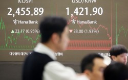 14일 오후 서울 중구 하나은행 본점 딜링룸 전광판에 증시가 표시되고 있다. 이날 코스피 지수는 전 거래일 대비 23.17p(0.95%) 상승한 2455.89로 마감했으며, 달러당 원화값은 28원 오른 1421.90원을 보이고 있다. 뉴스1 5대 시중…