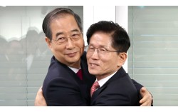 김문수 국민의힘 대선후보와 한덕수 전 국무총리가 11일 서울 여의도 국민의힘 대선후보 사무실에서 회동을 마친 뒤 포옹하고 있다. 김성룡 기자 김문수 국민의힘 대선 후보가 11일 한덕수 전 대선 예비 후보를 만나 선대위원장직을 제안했다. 한 전 후보는 “실…