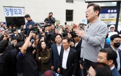 민심을 청취하는 '경청 투어'에 나선 이재명 더불어민주당 대선후보가 10일 경남 진주시 대안동 차없는 거리에서 시민들에게 연설하고 있다. 왼쪽은 김경수 총괄선대위원장. 뉴시스 더불어민주당 이재명 대선후보는 11일 민주당의 텃밭으로 불리는 전남 지역에서 유…