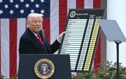 지난 2일 도널드 트럼프 미국 대통령이 전 세계를 대상으로 한 상호관세를 발표하며 각국에 부과하는 관세율이 적힌 차트를 들어보이고 있다. AFP=연합뉴스 도널드 트럼프 미국 대통령이 전 세계를 대상으로 상호관세를 부과하면서 상품교역에서 미국의 적자만 부각하고, 흑…