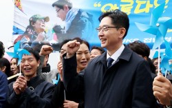 더불어민주당 김경수 전 경남도지사가 13일 세종시청에서 제21대 대통령 선거 출마선언을 마친 뒤 세종시청 광장에서 지지자들과 선거 승리를 다짐하고 있다. 뉴스1 김경수 전 경남지사는 13일 세종시청에서 기자회견을 열고 “행정수도를 세종시로 완전히 이전하겠…