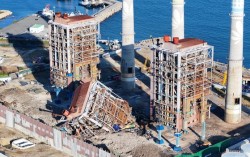 울산화력발전소 보일러 타워 붕괴 사고 닷새째인 10일 사고 현장 모습. 무너진 5호기 양옆의 붕괴 위험이 있는 4·6호기의 발파·해체를 앞두고 이날 오후 6시부터 발파 지점 반경 300m 내 인력과 장비를 철수하고 차량 진입 등을 통제하는 안전구역 설정 작업이 진행됐다…