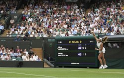 윔블던이 올해 인-아웃 판정에 ‘AI 심판’을 도입하면서 원래 전광판 옆에 서 있던 선심의 모습이 경기장에서 사라졌다. [AP=연합뉴스] 아나스타샤 파블류첸코바(34·러시아)와 소네이 카텔(24·영국)의 2025 윔블던 테니스대회 여자 단식 16강전이 열…