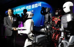 안덕근 산업통상자원부 장관이 10일 서울 중구 더플라자 호텔에서 열린 ‘K-휴머노이드 연합’ 출범식에서 인간처럼 생각하고 행동하는 AI 로봇인 휴머노이드와 악수하고 있다. 이날 출범한 ‘K-휴머노이드 연합’에는 서울대·레인보우로보틱스·LG전자 등 40여개 산학연 기관이…