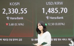 9일 서울 중구 하나은행 본점 딜링룸 현황판에 코스피, 원달러 환율이 표시돼 있다. 연합뉴스 코스피가 9일 장중 2300선 아래로 밀려났다. 이날 오후 1시 27분 현재 코스피 지수는 전일보다 39.81포인트(1.71%) 내린 2294.42다. 지수는 …