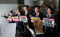 권성동 국민의힘 원내대표를 비롯한 의원들이 7일 서울 여의도 국회 법사위 회의장 앞에서 대통령에 당선되면 진행 중이던 재판을 정지하도록 규정한 더불어민주당의 '형사소송법' 개정안에 반발하며 피켓시위를 하고 있다. 뉴시스 더불어민주당 주도로 국회 법제사법위원회가 조…