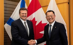 김희철 한화오션 대표(오른쪽)가 최근 더크 레스코 어빙조선소 사장을 만나 협력방안을 논의했다. 사진 한화오션 최대 60조원에 달하는 캐나다 초계 잠수함 프로젝트(CPSP) 수주전의 승자는 누가 될까. 6월말 사업자 최종선정을 앞두고 캐나다의 마음을 잡기위…