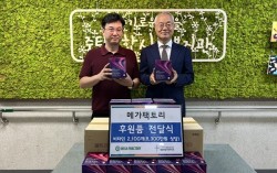 (좌)메가팩토리 대표 약사 정두선, (우)증탐종합사회복지관 관장 강일조 경기 성남시 소재 메가팩토리약국이 최근 성남시 내 복지기관을 통해 약 8,300만원 상당의 멀티비타민 제품을 기부했다. 기부 물품은 '울트라B12 부스터'로, 18종의 비타민과 미네랄이 …