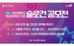 슬로건 당선작 이미지 부산대학교가 내년 2026년 개교 80주년을 기념해 전 국민을 대상으로 개최한 ‘부산대학교 80주년 슬로건 공모전’이 대학 구성원은 물론 시민들의 뜨거운 관심과 참여 속에 성료됐다. 부산대학교(총장 최재원)는 내년 개교 80주년…