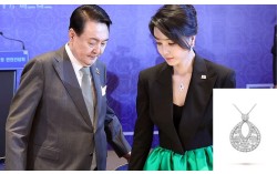 윤석열 전 대통령과 김건희 여사가 지난 2022년 6월 29일(현지시각) 스페인 마드리드 시내 호텔에서 열린 동포 만찬간담회에 참석하고 있다. 대통령실사진기자단. 목걸이 사진 반클리프 앤 아펠 홈페이지 지난 25일 김건희 특검팀(특별검사 민중기)이 김건희…