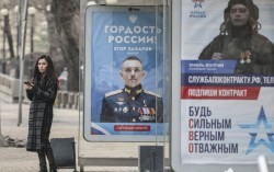 러시아 모스크바의 한 버스 정류장에서 한 여성이 군 복무 모집 광고 앞에서 버스를 기다리고 있다. EPA=연합뉴스 블라디미르 푸틴 러시아 대통령이 올해 가을 18~30세 러시아 시민 13만5000명을 대상으로 한 정례 징집령에 서명했다고 29일(현지시간)…