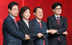 이철우(왼쪽부터), 나경원, 홍준표, 한동훈 국민의힘 대선 경선 후보들이 20일 오후 서울 강서구 ASSA아트홀에서 열린 제21대 대통령 후보자 1차 경선 B조 토론회에서 기념촬영을 하고 있는 모습. 뉴스1 “저도 선배님 좋아합니다.”(한동훈 후보) …