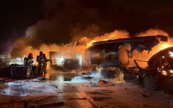 17일 오전 3시 12분께 상주영천고속도로 양방향에서 대형 교통사고로 화재가 발생해 소방당국이 진압하고 있다. 경북도소방본부 제공 17일 새벽 경북 상주영천고속도로에서 유조차(탱크로리)와 화물차, 승용차 등이 연쇄 추돌하면서 2명이 숨지고 4명이 다쳤다.…