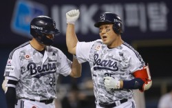 양의지 동점 만드는 솔로포 (서울=연합뉴스) 신현우 기자 = 4일 서울 잠실야구장에서 열린 프로야구 2025 신한 SOL 뱅크 KBO리그 KIA 타이거즈와 두산 베어스의 경기. 5회말 2사 두산 양의지가 솔로홈런을 친 뒤 기뻐하고 있다. 2025.6.4 no…