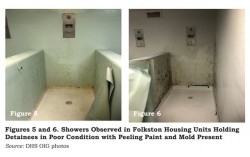미국 이민 당국에 체포된 한국인 300여명 중 대부분이 수감된 미국 조지아주 포크스턴의 이민세관단속국(ICE) 시설의 샤워장. 이 사진은 2021년 11월 진행된 미국 국토안보부(DHS)의 감사 당시 촬영됐다. 美 국토안보부= 연합뉴스 미국 이민 당국에 의해 구금…