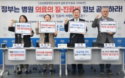 29일 서울 종로구 경실련 강당에서 열린 '상급종합병원 비급여 실태 분석 발표' 기자회견 중 참석자들이 피켓을 들고 있다. 사진 경실련 화순전남대병원을 비롯한 상급종합병원 7곳은 환자 사망비가 낮고 진료비가 저렴한 반면, 고대안암병원 등 3곳은 사망비가 …