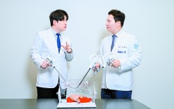인터뷰 박영석·전동재 교수 분당서울대병원 비만대사센터 외과 평균 30%의 체중 감소 효과 얻어 대사질환 예방하고 생존율 향상 비만은 만성질환, 적극 치료해야 분당서울대병원 박영석(오른쪽)·전동재 교수가 복강경 기구 ‘아티센셜’을 작동해 보며 수술 방식을 논의하고 있다…
