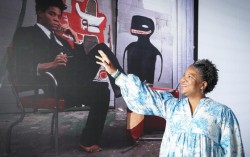 장 미셸 바스키아의 여동생인 제닌 에리보(58)가 22일 서울 동대문디자인플라자(DDP)에서 오빠의 27살 때 사진을 가리키고 있다. 언니 리잔과 바스키아 재단을 공동 관리하는 그는 ‘장 미셸 바스키아: 과거와 미래를 잇는 상징적 기호들’ 전시에 맞춰 처음 한국을 찾았…