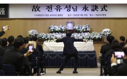 28일 엄수된 고 전유성의 영결식에서 후배 개그맨 김정렬이 생전 고인이 좋아했던 ‘숭구리당당’ 퍼포먼스를 하고 있다. [연합뉴스] “마지막 가시는 길이 엄숙하게 진행되는 걸 별로 안 좋아하실 것 같습니다.” 28일 오전 7시40분께 서울 영등포구 여…
