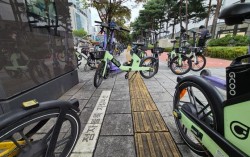 25일 오전 서울 송파구 잠실역 2번출구 인근 20m 가량 이어진 점자블록을 오토바이와 전동킥보드가 빽빽하게 가로막았다. 이곳은 ‘점자블록 지킴이선’이 표시된 곳이다. 오소영 기자 서울시 종로구에 거주하는 대학생 김운하(23)씨는 길을 걸을 때마다 점자블록 위에…