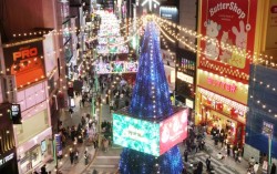 29일 밤 ‘2025 광복로 겨울빛 트리 축제’를 찾은 시민과 관광객이 대형 트리와 조형물들을 보고 있다. 부산 중구 광복로에서 열리는 이번 트리 축제는 내년 2월 22일까지 진행된다.