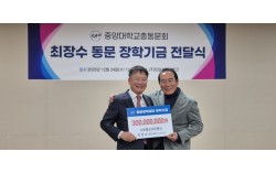 최장수 회장(오른쪽)과 신현국 중앙대 총동문회장 행정고시 1차 시험 합격생을 위한 장학기금 조성 중앙대학교(총장 박상규) 캠퍼스에 연말을 앞두고 특별한 크리스마스 선물이 전해졌다. 최장수 토탈소프트뱅크 회장(중앙대 행정학과 60학번)이 24일 부산 해운…