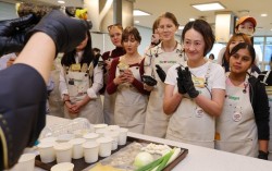 지난 15일 서울 송파구 가락몰 쿠킹스튜디오에서 열린 코리안푸드 쿠킹클래스에서 외국인들이 김밥 만드는 과정을 지켜보고 있다. 이날 메뉴는 넷플릭스 영화 '케이팝 데몬 헌터스'에서 화제가 된 김밥, 떡볶이, 빈대떡 등 3가지 음식으로 구성했다. 뉴스1 애니…