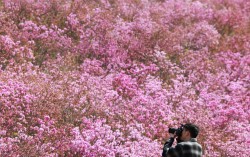 13일 경기도 부천시 원미산 진달래동산에서 한 시민이 활짝 핀 진달래꽃을 카메라에 담고 있다. 기상청에 따르면 내일(14일)도 동두천·홍천의 낮 최고기온이 26도까지 오르는 등 때이른 초여름 날씨가 이어지겠다. 전국 아침 최저기온은 7~12도, 낮 최고기온은 14~26…